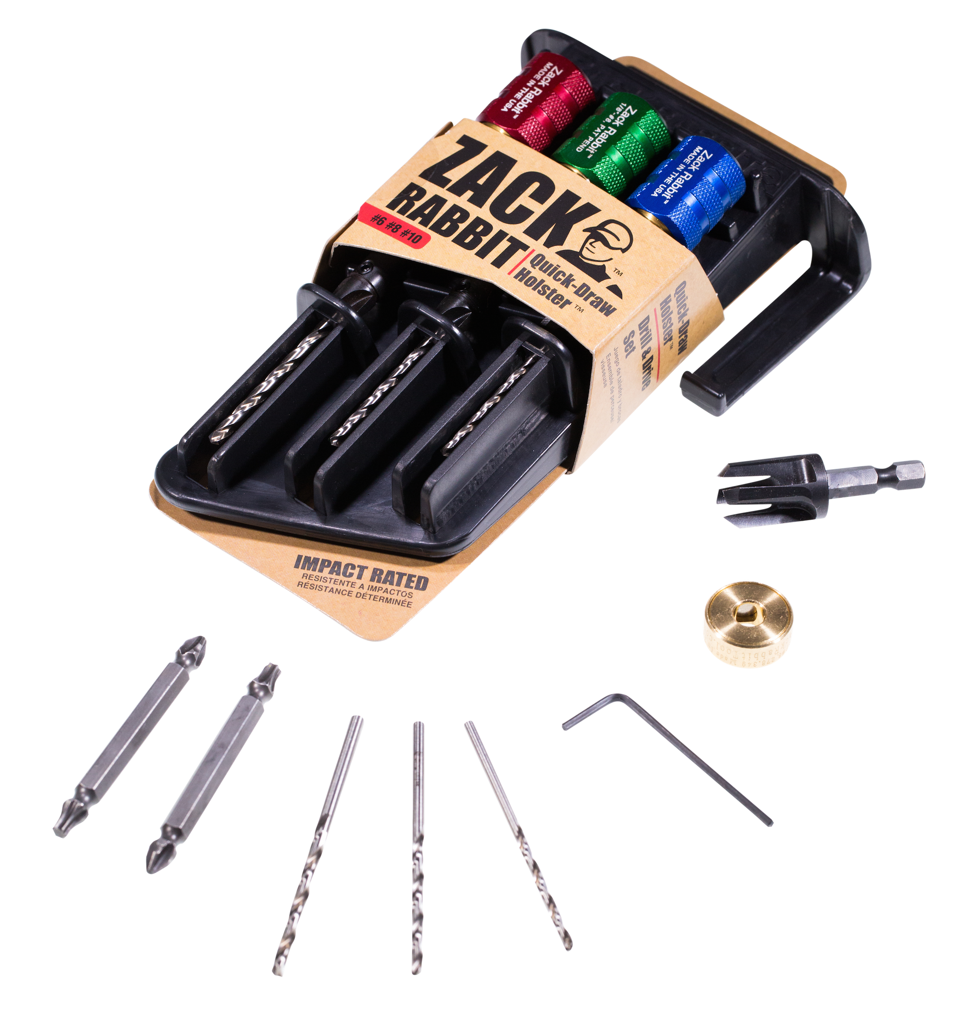 Our 3/8" four-fluted countersinks are ideal for wood plugs, and the Mag Ring® Bit Magnetizer keeps your screw on the driver bit in those tricky situations. The Quick Draw Holster™ allows for hands free operation and doubles as a parts organizer!